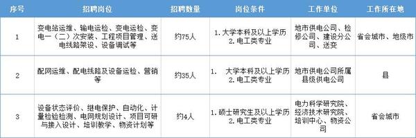 2019年一批招聘条件:招聘学历及专业:电工类专业本科以上学历为主,适量招收计算机、通信等电子信息类专业研究生;其他招聘条件:本科生一般不超过25周岁、硕士研究生一般不超过28周岁、博士研究生一般不超过33周岁。毕业生年龄计算的截止时间为2019年6月30日。No.4朔州供电公司