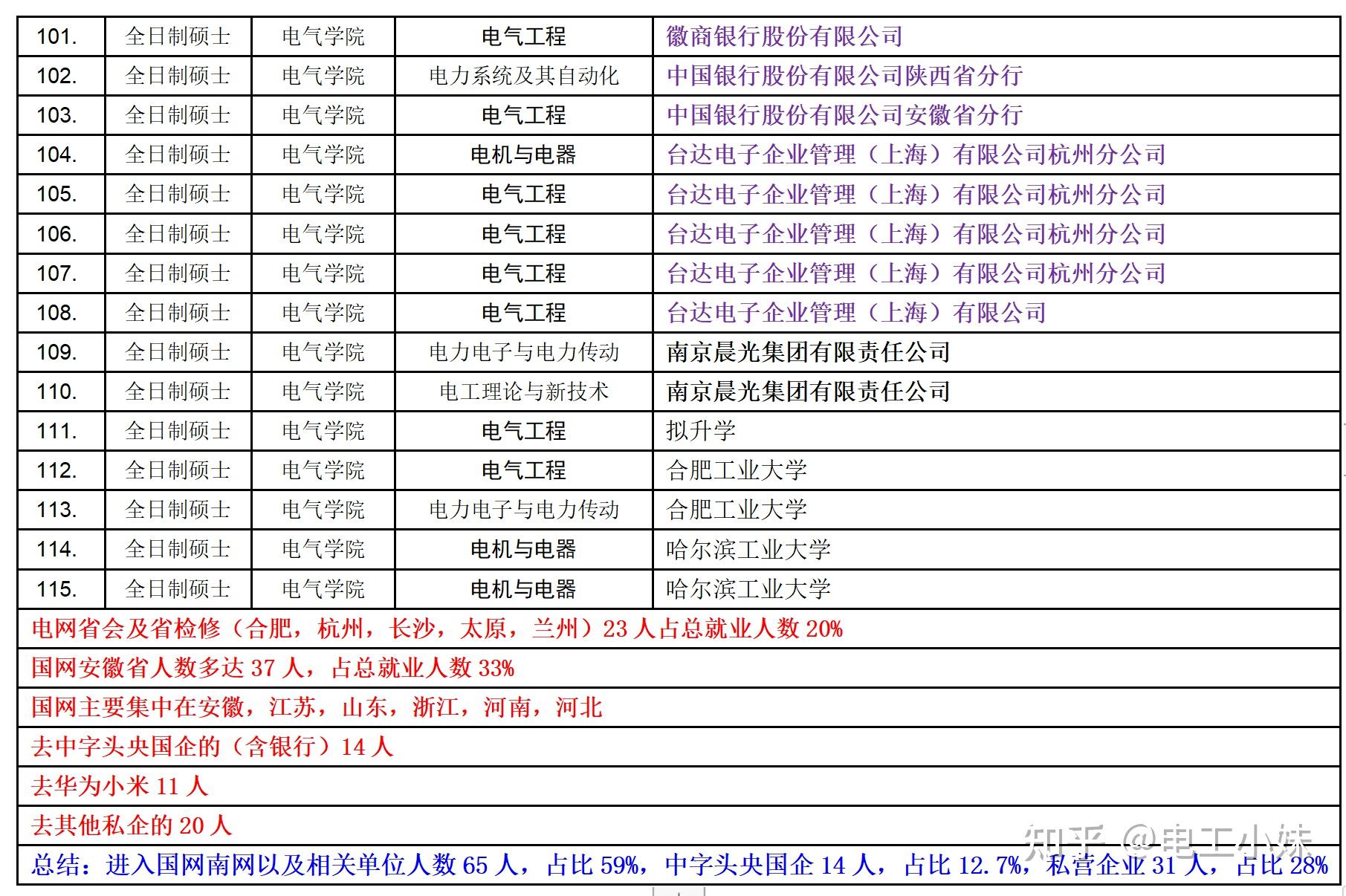 电网省会及省检修(合肥,杭州,长沙,太原,兰州)23人占总就业人数20%a国网安徽省人数多达37人,占总就业人数33%a国网主要集中在安徽,江苏,山东,浙江,河南,河北a去中字头央国企的(含银行)14人a去华为小米11人a去其他私企的20人a总结:进入国网南网以及相关单位人数65人,占比59%,中字头央国企14人,占比12.7%,私营企业31人,占比28%。