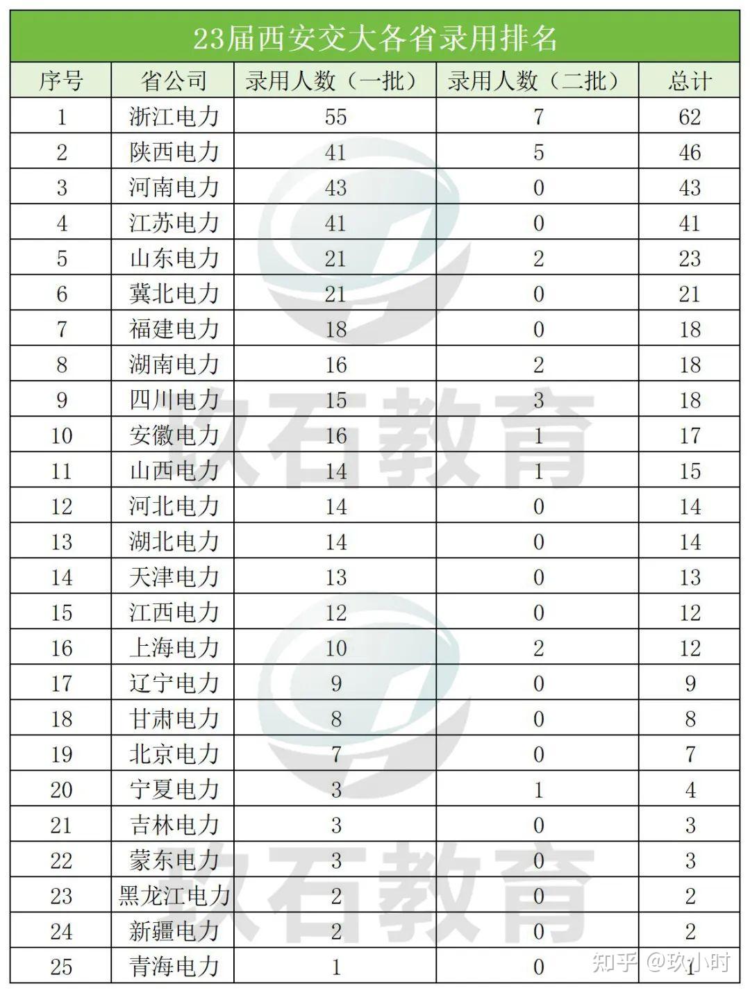由数据可见浙江电力23届录用西安交大学子共62人,录用人数排名第一。另外,陕西、河南、江苏省电力均录用40+人,且有25个省单位都录用了交大学子,足见西安交大学子很受国网偏爱了。