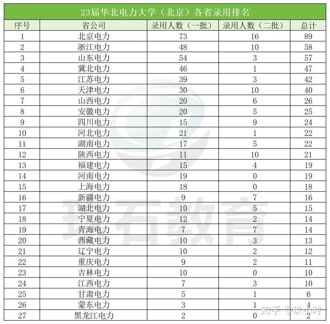 由23届录用数据可知,华北电力两校区都是国家电网的“宠儿”。华电在国网所辖27个省级行政单位中均有涉猎北京电力两批次共招收华北电力大学北京校区89人,排名第一。浙江电力及山东电力两批次分别招聘58人、57人排名第二第三。