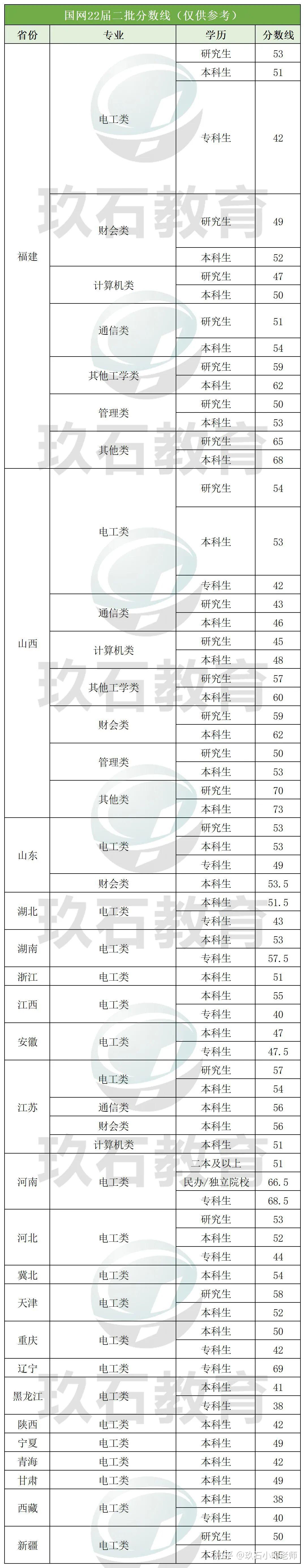 23届二批总的来说难度比22届更大,23届二批考试电工类本科进面分数线综合在38.7分,比22届二批次平均进面成绩46.5分 低近了8分。进面分数各省官方不公布,数据由玖石君收集而来,供参考。