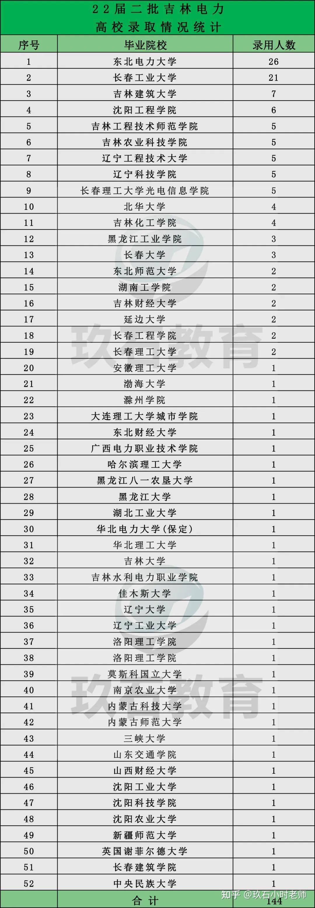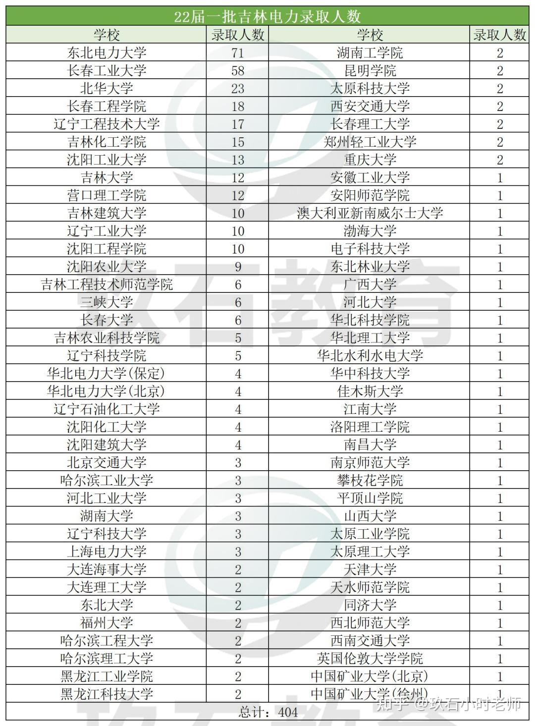 22届一批国网吉林电力共录用404名学生,22年一批吉林电网招聘结果中,招聘人数最多的是东北三省知名的原电力部属高校东北电力大学,其次是长春工业大学、北华大学等都是是省内的普通本科院校。