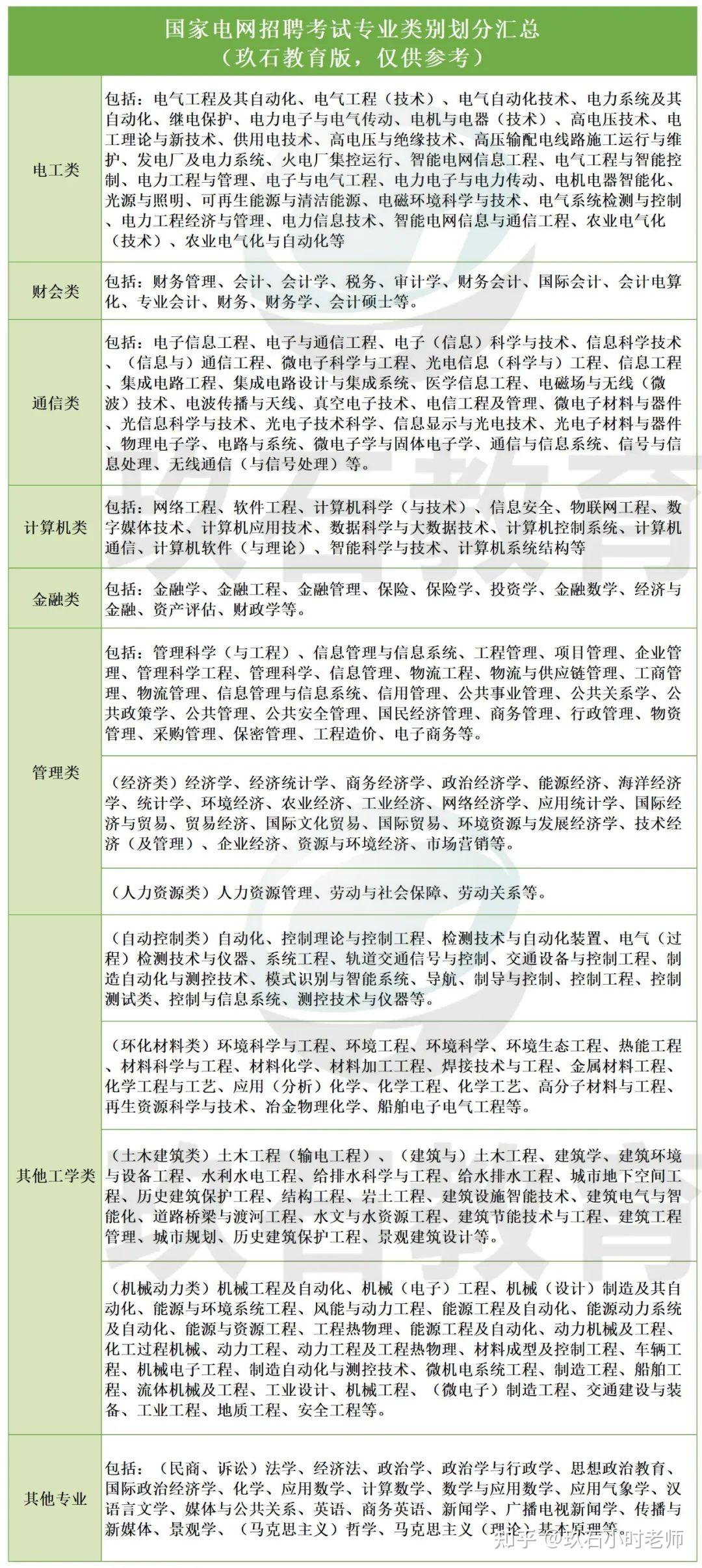 想要进入国家电网,首先我们需要了解国家电网招聘的对口专业。国网招收八大专业类别分别是:电工类、通信类、计算机类、财务会计类、金融类、管理类、其他工学类、其他专业类。其中电工类专业每年招聘人数做多,其他非电专业招收人数相对少一些。下列表格囊括各专业类别的常见专业,可供参考。