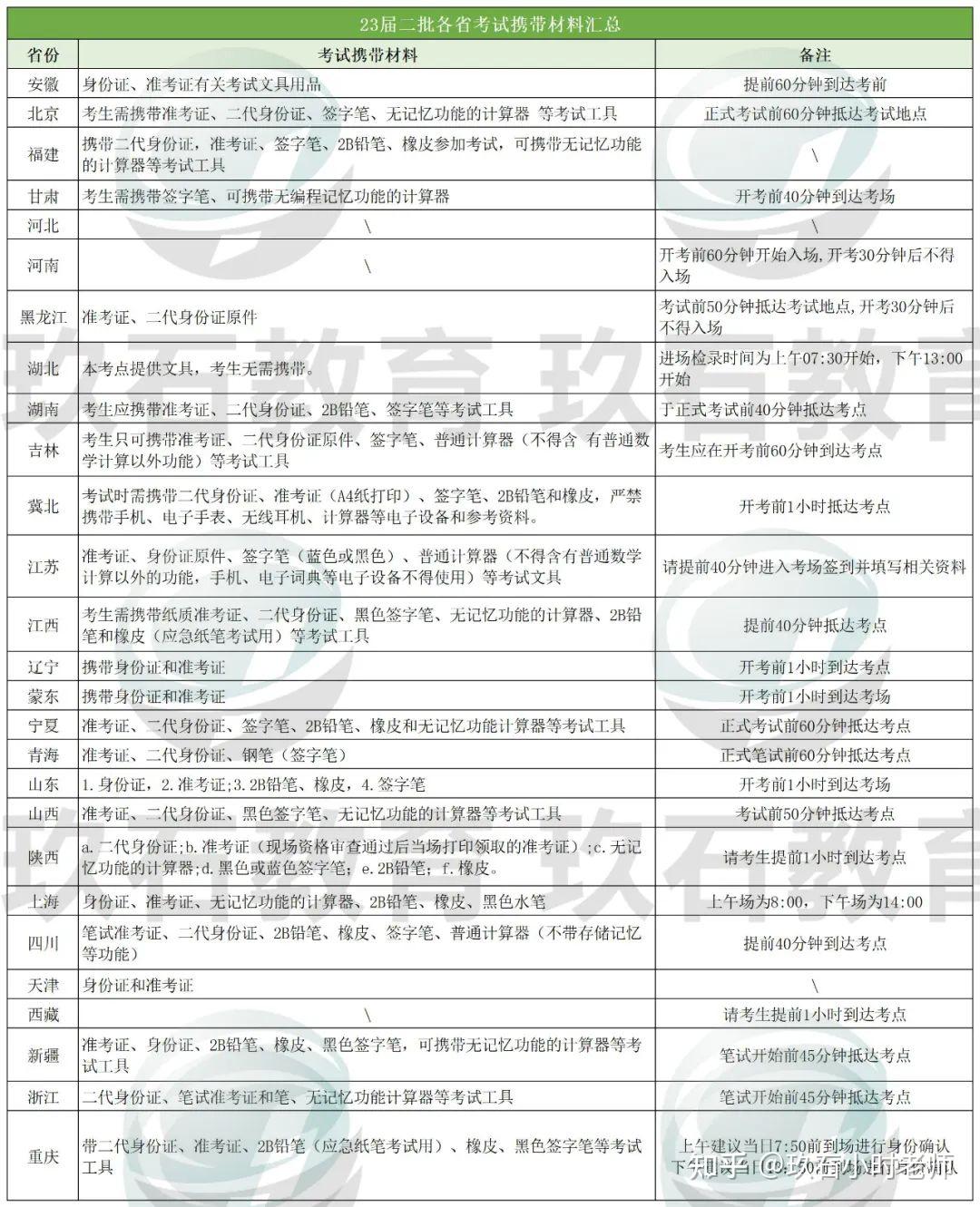 各省份均要求必须携带身份证、准考证,部分省份可以携带无记忆功能计算器,具体以公告信息为主。各省份对于提前到达考点时间要求不同,同学们需注意到场时间,以免错过参考机会。