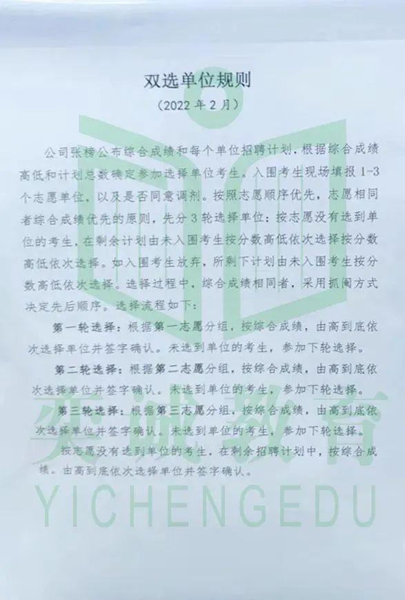 22届一批河南双选公告规则公司张榜公布综合成绩和每个单位招聘计划,根据综合成绩高低和计划总数确定参加选择单位考生。入围考生现场填报1-3个志愿单位,以及是否同意调剂。按照志愿顺序优先,志愿相同者综合成绩优先的原则,先分3轮选择单位;按志愿没有选到单位的考生,在剩余计划由未入围考生按分数高低依次选择按分数高低依次选择。如入围考生放弃,所剩下计划由未入围考生按分数高低依次选择。选择过程中,综合成绩相同者,采用抓阉方式决定先后顺序。选择流程如下:第一轮选择:根据第一志愿分组,按综合成绩,由高到低依次选择单位并签字确认。未选到单位的考生,参加下轮选择。第二轮选择:根据第二志愿分组,按综合成绩,由高到低依次选择单位并签字确认。未选到单位的考生,参加下轮选择。第三轮选择:根据第三志愿分组,按综合成绩,由高到低依次选择单位并签字确认。未选到单位的考生,参加下轮选择。按志愿没有选到单位的考生,在剩余招聘计划中,按综合成绩。由高到底依次选择单位并签字确认。在22届二批的面试公告,江西电力公司就说明,面试前会给学生招聘计划,同学们再从招聘计划中选取志愿,面试后用以上方式进行录取。