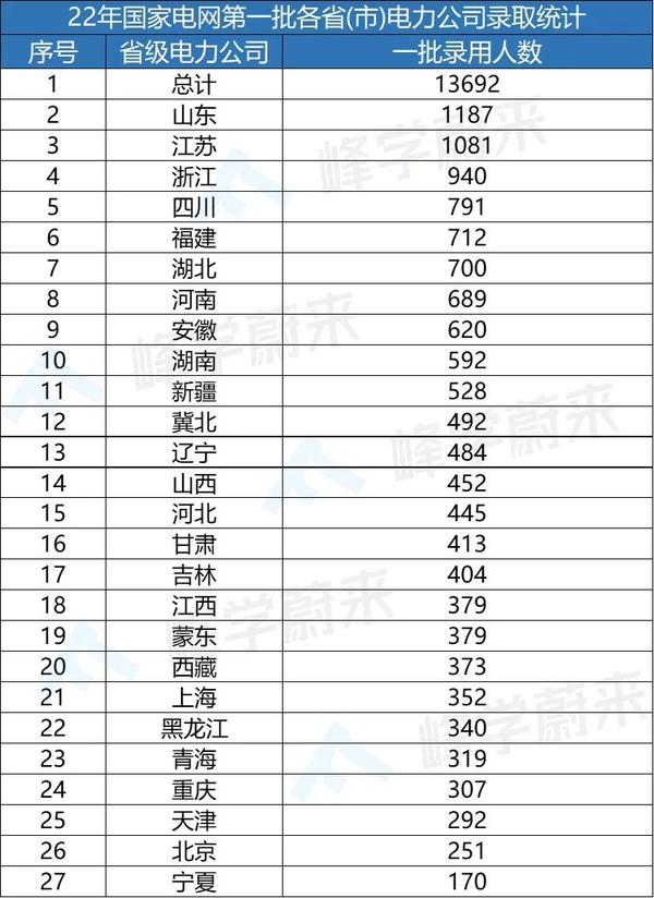 一般,国家电网分成3批次招聘,3批次招聘也有所区别提前批:一般是每年9-11月进入指定高校或网络进行宣讲招聘,招聘类别主要以电工类为主,也会招聘少量计算机类和通信工程类。招聘学历较高,主要电工类以985、211工程院校和原电力部属院校硕士研究生为主。第一批:一般是每年11月报名、12月初考试,招聘类别以电工类为主,但也会招聘电子信息类(计算机和通信工程)、其他工学类、财务会计类等,部分公司第一批只招聘电工类,学历要求所有类别都是二本及以上学历,符合专业条件,对院校没有太多的限制要求。第二批:一般是每年3月报名,4月考试。招聘类别电工类及其他类别都会招聘,部分公司会把除电工类以外的其他类别重点放在第二批。学历要求上二批要求要比一批要求低一些,部分省份的电工类也会招聘专科岗位。看完了三个批次的介绍后,是不是就要问了,想进国家电网要选什么呢?没错,就是电气类专业。首先我们整理了22年一批录用省份,先看看这些数据统计,看完后,我们就来了解一下专业。