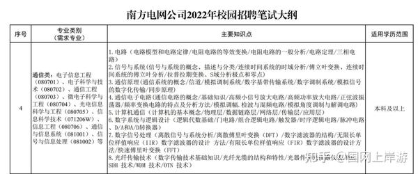 (一)信息发布各招聘单位在南方电网员工招聘系统(http://zhaopin.csg.cn)“招聘公告”栏目发布招聘公告,具体内容和投递截止日期详见各单位公告。(二)简历投递1.填写个人简历。应聘毕业生通过系统填报简历,上传有关材料(如成绩单、学籍验证报告、就业推荐表和相关证书证件等)。提交后将不能修改,请应聘毕业生仔细检查后提交。2.申报应聘单位。每位应聘毕业生最多可申报南方电网公司所属3家单位(即3家二级单位),每家单位可选择的下属单位数量及岗位数量详见各单位公告。应聘单位和岗位志愿提交后将不能修改,请应聘毕业生认真思考、慎重填报。(三)考核测评1.统一笔试(1)笔试由南方电网公司统一组织实施。笔试范围包括综合知识(占30%)和专业知识(占70%),其中专业知识考试内容按应聘毕业生所学专业的类别进行划分。南方电网公司2023年笔试大纲详见附件。(2)笔试时间:预计2023年7月20日(星期三)。笔试前1周内,南方电网公司将通过电话、手机短信、电子邮件等方式,通知入围应聘毕业生参加笔试考试。(3)笔试成绩在南方电网公司各招聘单位之间通用,各单位不再另行组织笔试。2.面试安排各单位根据笔试成绩,自主实施面试,通过电子邮件、电话或手机短信等方式通知入围面试毕业生参加面试。(四)录用与公示各单位根据应聘毕业生笔试、面试的综合成绩择优录用,并在招聘系统对录用名单进行公示。5注意事项(一)为保证及时收到招聘环节的相关通知信息,请应聘毕业生及时登录公司招聘系统查看,并根据要求确认回复。同时,请保持注册手机、邮箱等联系方式的畅通。(二)如考试时间发生调整,将另行通知。请广大应聘毕业生及时关注南方电网公司员工招聘系统公告栏目。附上通信类考纲: