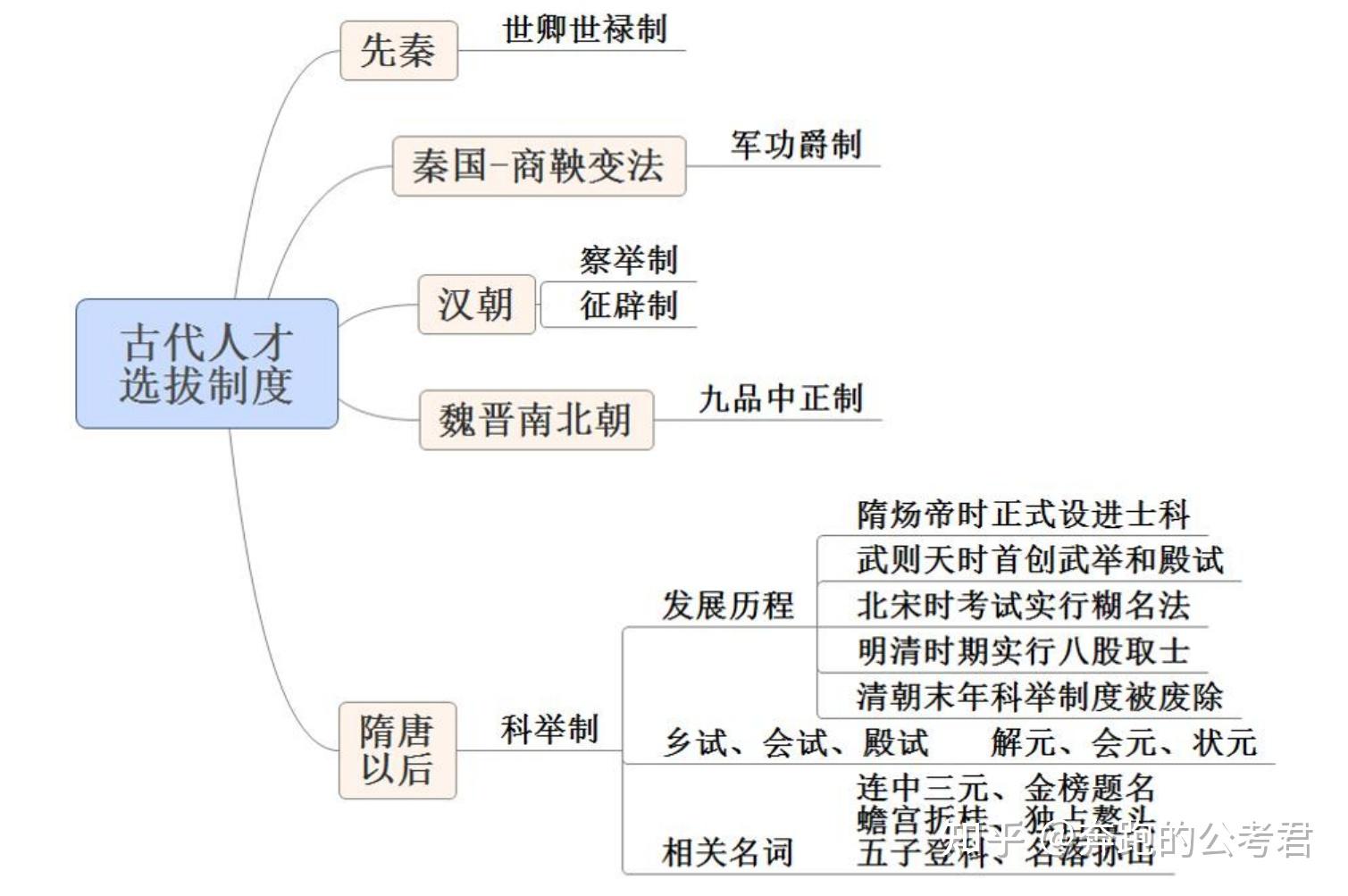 1.先秦:世卿世禄制,秦朝以前官位是代代相传的,贵族世代为官,完全看关系,起不到人才选拔的作用,后逐渐被打破。