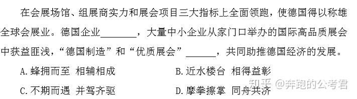 以该题为例,第一空,横线处搭配“企业”,后文“大量中小企业”对应前文“德国企业”,对横线处进行解释说明,“家门口”体现离得近、获益多,对应 B项“近水楼台”。A 项“蜂拥而至”指一群人乱哄哄地朝一个地方聚拢,为中性偏消极词,多搭配地方、领域或人,如对一个人的批评蜂拥而至,与文意不符,排除。C 项“不期而遇”指事先没有约定而遇见,D 项“摩拳擦掌”形容战斗或劳动之前,人们跃跃欲试的样子,均与文意无关,排除。 找好关键词,正确对应,言语题目尽在掌握。
