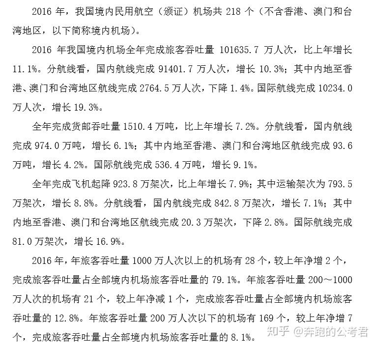 做提前的看。拿到一篇材料,尤其是文字材料时,就需要观察主体结构。以2018年山东省考为例,这一篇几百字的资料,我们并不需要都看,具体需要看时间和名称。第一段:时间 2016 年,我国境内民用航空(颁证)机场数量;第二段:2016 年我国境内机场全年完成旅客吞吐量多少,分航线看,国内航线完成多少,其中内地至香港、澳门和台湾地区航线完成多少,国际航线完成多少;第三段:全年完成货邮吞吐量多少,分航线看,国内航线完成多少,其中内地至香港、澳门和台湾地区航线完成多少,国际航线完成多少;第四段:全年完成飞机起降多少,其中运输架次多少,分航线看,国内航线完成多少,其中内地至香港、澳门和台湾地区航线完成多少,国际航线完成多少……