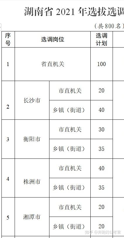 2021年湖南全省计划选调800名,其中省直机关100名、市州直机关350名(定向),乡镇350名(非定向)。 而2020年总共计划选调600人,定向招考400人,非定向招考200人,湖南省属一本选拔100名。总体的人数增加了,但定向只增加了50人,不过还好的是今年省直岗位挺多的。