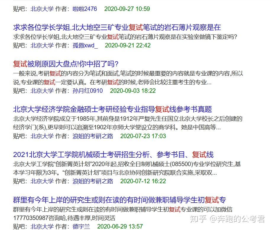 学校贴吧虽然广告比较多,但有用的信息还是蛮多的,尤其是到笔试成绩出来之后,分数的相关投票统计,复试要注意的事项和内容都有相关的回复。还是以北京大学的贴吧为例,搜索“复试”,能找到很多的复试真题和复试指导等。