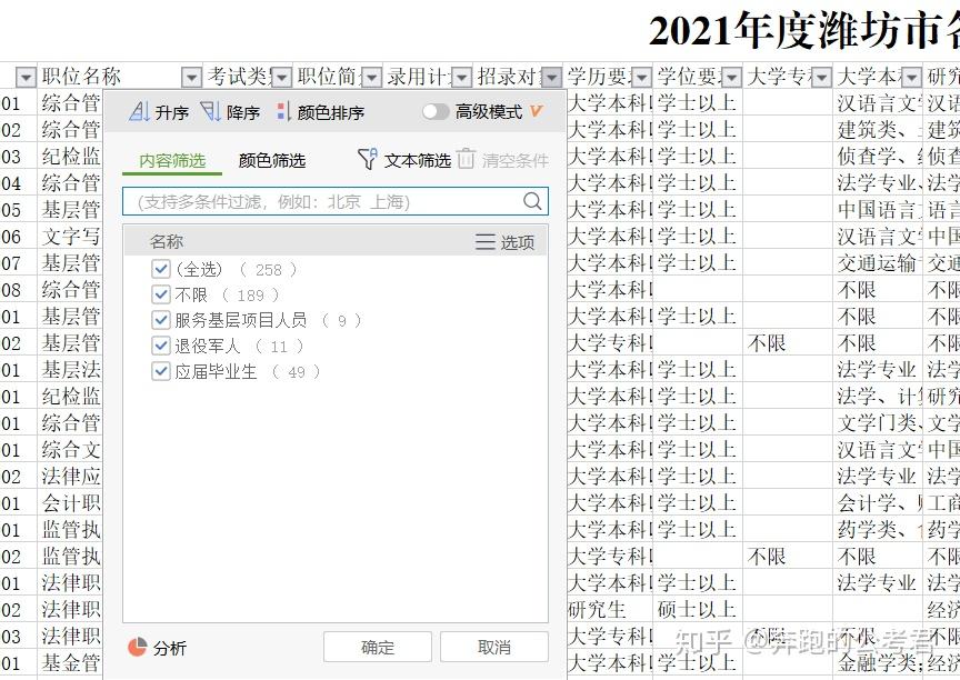再来看一下潍坊的岗位表情况,一共有258个岗位,其中针对应届毕业生的有49个岗位,是多还是少呢,看一下泰安的。