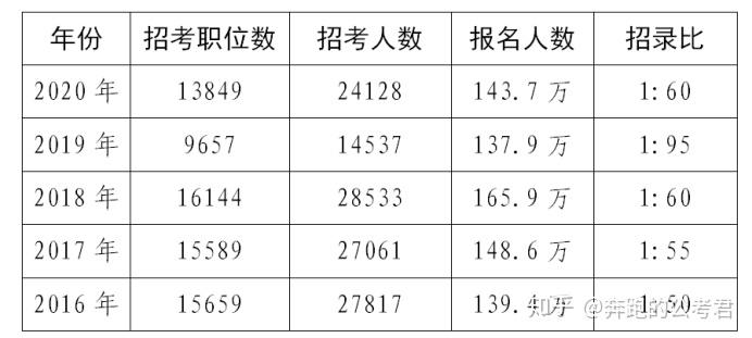 先来看一个表格,2016年至2020年国考的相关数据及比例,正是应了那句话,千军万马过独木桥,国考的难度还是非常大的。