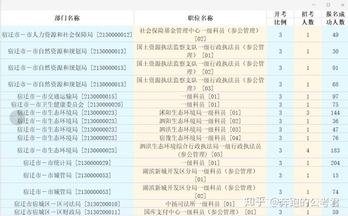 基本是市直、县(市区)直各单位,这些岗位是报名人数相对较多,也是我们报考最普遍的岗位。还是以宿迁市招考岗位为例,各个局的报考比例基本都达到1:50以上,从与第一档的对比中可以看出明显的难度差距。