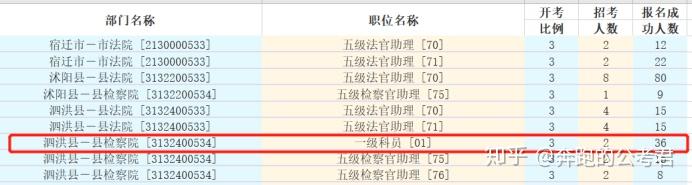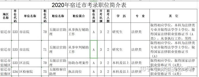 以宿迁市招考的法检岗位为例,报考比例基本都在1:10以内,有的岗位甚至刚到开考比例,大家可能也发现了一个报考比例比较高的岗位,应该也仔细看了“职位名称”,其实招考的人员是不同的,也不是法学岗。一般来说法检岗位竞争比例较低,是因为有着这个限制条件——国家法律职业资格证书(A),也就是我们通常所说的司法考试,而同样招收法学专业的宿迁市公安局,招考人数为3人,报名人数为49人,基本上还是可以看出比例差距的,当然1:16的报考比例相比于其他岗位来说也没那么高。