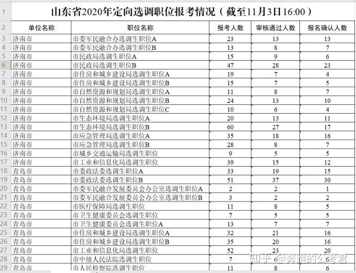 再来看一个表格,2020年山东定向选调报考数据,以济南和青岛为例,平均报考比例还是相对较低的。