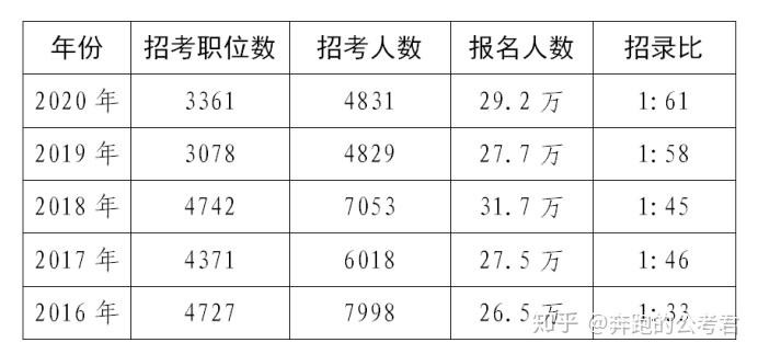 再来看一个表格,2016年至2020年浙江省考的相关数据及比例,从招录比来看,省考的竞争比例是要略低于国考的,但竞争依然很大。