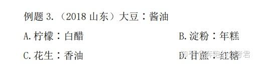 若了解“年糕”主要是糯米做的,“香油”只要是芝麻做的,可以直接选 D 项。若没有常识,考查原材料的对应关系,常见的二级辨析——主要与次要原材 料、直接与间接原材料、天然与人造原材料。 题干:“大豆∶酱油”原材料的二级辨析可以是天然和人造,也可以是主要 和次要。“酱油”主要是“大豆”做的,“大豆”是主要原材料。 B、C 项:“淀粉”“花生”均不是主要原材料,均排除。 D 项:“甘蔗”是“红糖”的主要原材料,当选。 若没有常识,不了解主要/次要原材料,考虑天然与人造原材料。题干“大 豆”是天然的,“淀粉”不是天然的,“花生”和“甘蔗”是天然的。如果具备常识,可以直接选出正确答案,因为“香油主要是芝麻做的”,如果没有常识,要做到只能在 C、D 项中选择,不能选 B 项,因为二级辨析至少可 以排除 B 项。