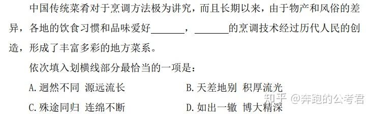 以该题为例,第一空,“由于物产和风俗的差异”说明各地不一样,故横线处 也应体现不一样,A 项“迥然不同”指完全不一样,B 项“ 天差地别”形容有差 别、不一样,均体现有差别,保留。 C 项“殊途同归”指走得路不一样但最终达到的目的地一样,也可以比喻做事的方式不同,但最终效果相同;D 项“如出一辙”表示一样,与文意不符,均排除。 第二空,搭配“烹调技术”,“历代人民”说明烹调技术经历的时间长,A 项 “源远流长”表示历史久远,体现时间长,当选。B 项“积厚流光”是指积累的功业越深厚,则流传给后人的恩德越广,与“烹调技术”搭配不当,也体现不出时间长的含义,排除。找好关键词,正确对应,言语题目尽在掌握。