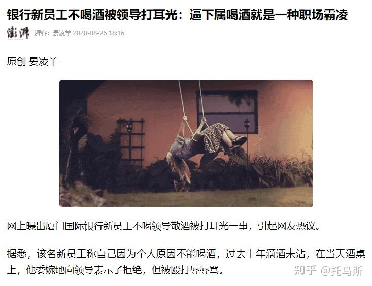 上面这则新闻是近几年发生在某银行的时间,这还是国有银行,还保留有一定体制内单位的基因,领导都敢如此嚣张,你敢想象那些纯粹的私企是什么作风吗?哪个体制内单位的领导敢因为下属不喝酒就打人家耳光?