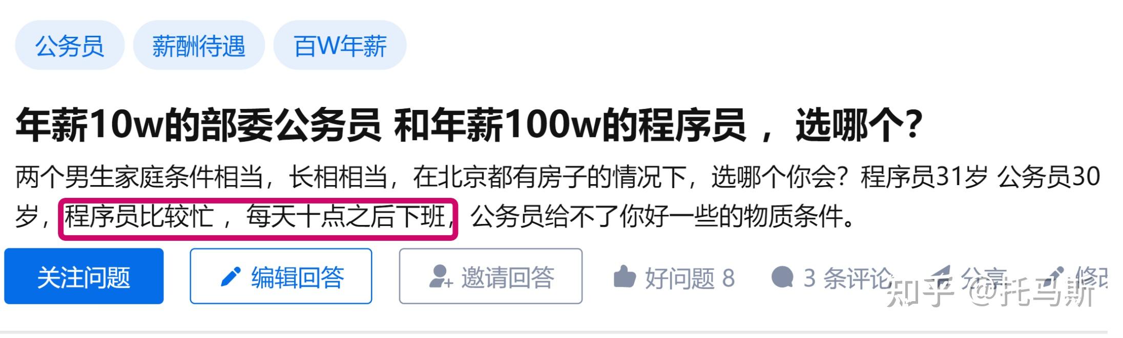 当然,说了这么多,我并不是说年薪 100 万的程序员就比部委公务员好,我只是想告诉你,部委公务员并没有很多人想象中的、或者吹牛般的那么好。