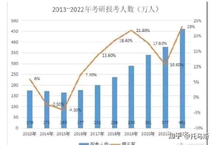 从2016年开始,考研人数开始暴涨,到2020年的时候,仅仅用5年时间就翻了一倍。到了2022年,考研人数更是达到了创纪录的462万人,大多数专业的分数线比上一年直接暴涨10分。甚至有媒体预测,2023年考研人数可能会突破520万、甚至550万。