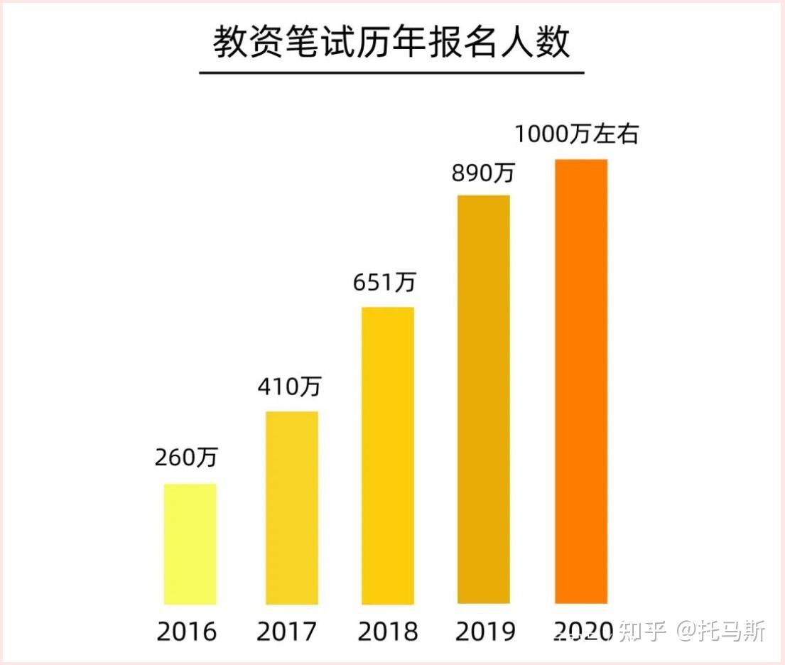 从2016年开始,教师资格证报名人数开始暴涨,2020年的时候,就已经达到了990万,翻了近两番。2022年的数据目前还没有权威统计,不过大家可以大胆的猜一猜,我觉得可能会让人惊掉下巴。