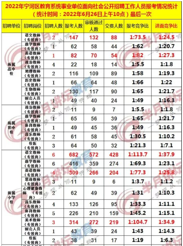 2023年一招单考学科,二招单考教综,2022年宁河区教招竞争比及进面分数