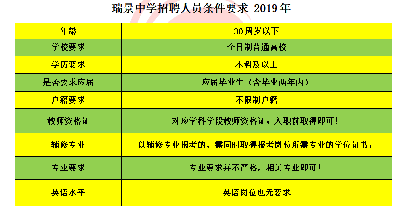 瑞景中学在招聘条件上算宽松的了,本科及以上,辅修专业可报,应届含两年内,英语水平无要求,这个条件在区招里都算是非常宽松了,但是瑞景中学在2023年并没有招聘,但同学们也要关注一下今年公告情况。