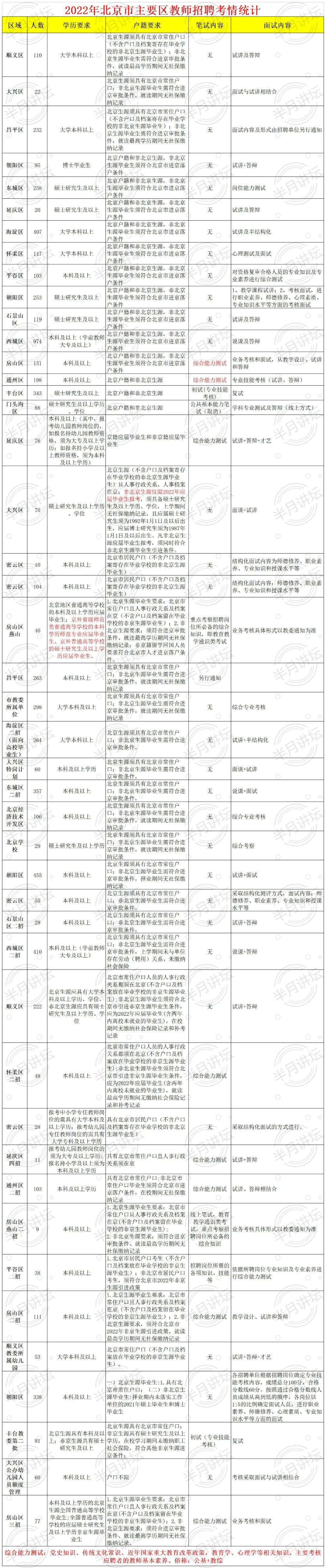 3、北京市大部分区无笔试,报名简历筛选符合后直接进行面试,部分区笔试主要考综合能力测试(俗称:公基+教综)很少涉及学科内容;