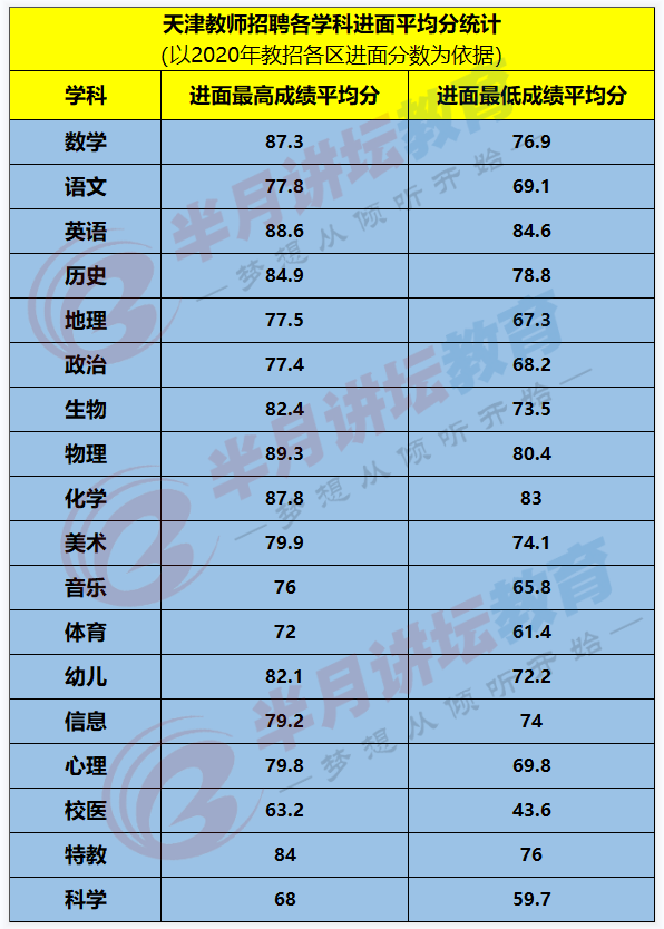 静海区去年是中天人力出题,没有公布报考人数,无从统计,根据已有数据,我总结了各区各学科平均进面最高最低成绩,大家参考一下。