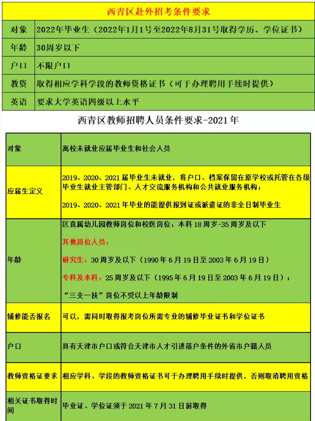赴外招聘年龄限制在了30周岁以下,但是有个前提条件是2022年应届生,25周岁以上的应届生也很少,所以,今年西青区年龄要求可能还会是本科25周岁以下,研究生30周岁以下。