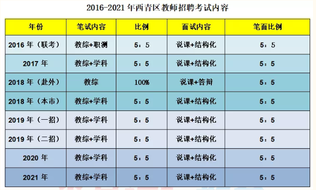 近几年西青区考试内容比较稳定,笔试:教综+学科;面试:说课+结构化。值得注意的是:赴外招聘笔试内容只有学科! 面试仍是说课和结构化。