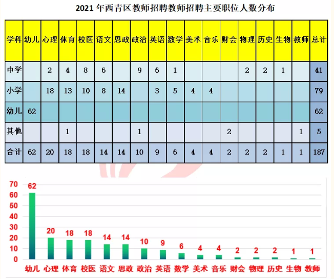 2023年西青区招聘量最多的还是幼儿学科,中学学段共招聘41人。