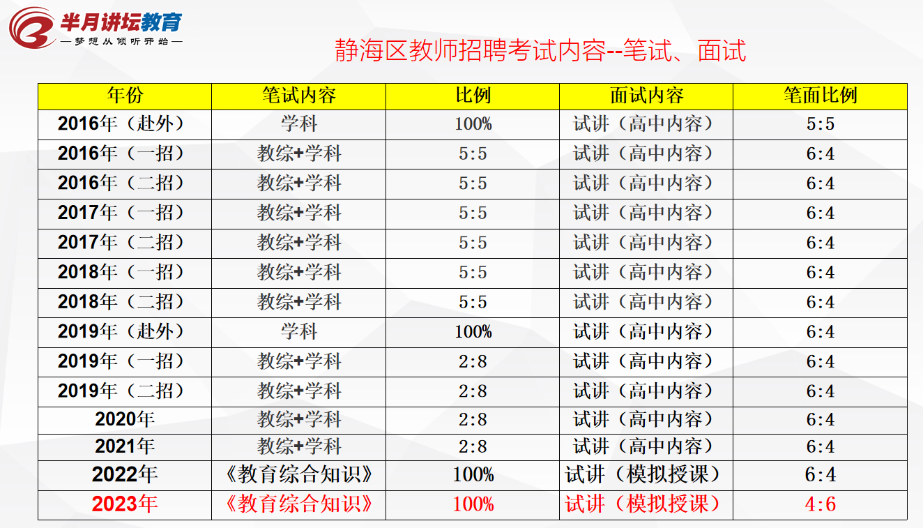 静海区3月20号报名,4月8号笔试,考试内容笔试只有教综,因为都限制专业嘛,自己人主要比教综了;笔面比例有所调整,面试占比变高!不过到5月20号才面试,中间有充足的面试准备时间!