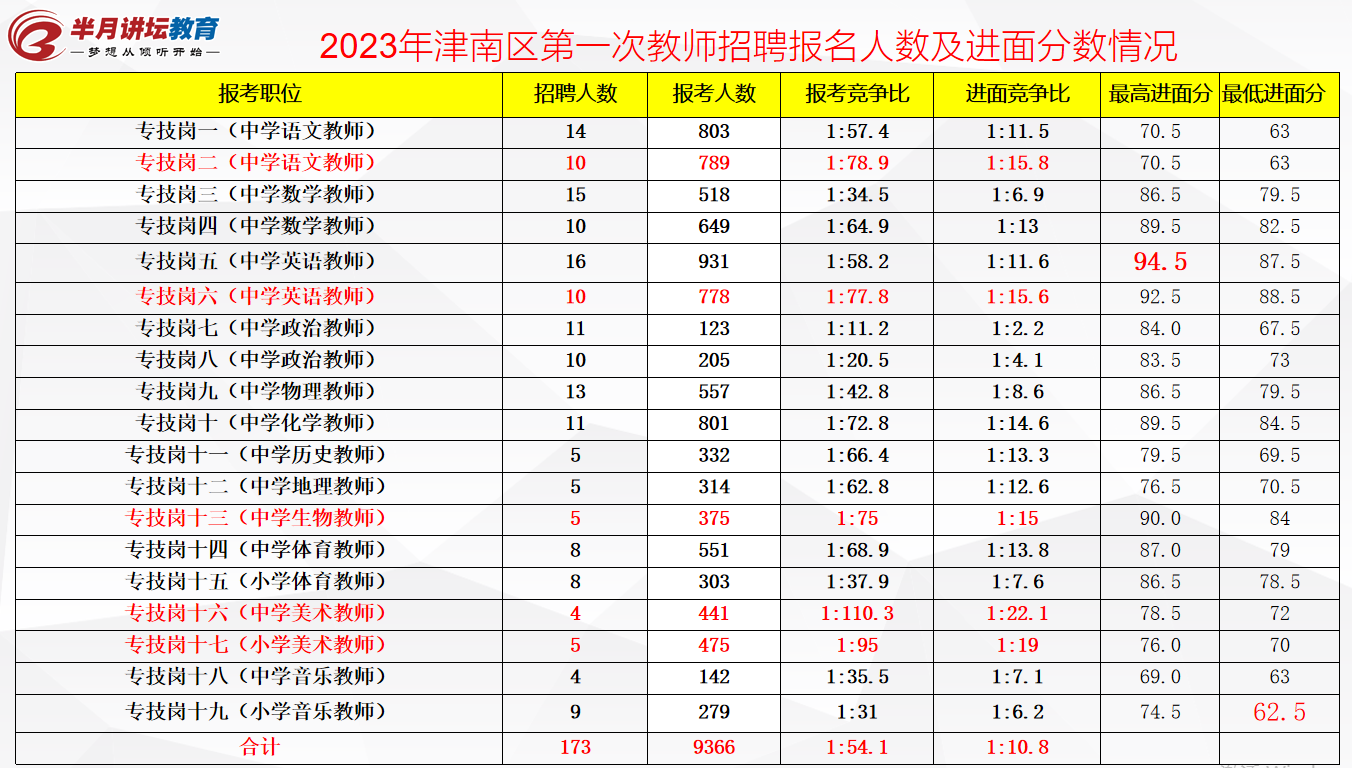 2023年津南区一招各学科竞争比及进面分数