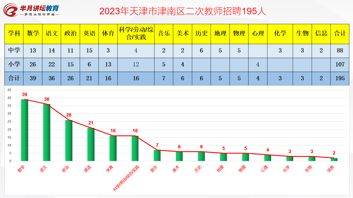 本次共计招聘195人,其中中学学段88人,小学学段107人,招聘人数最多的学科是数学学科,招聘39人,语文学科教师招聘36人,科学等学科教师招聘数量也不少,招聘了16人。