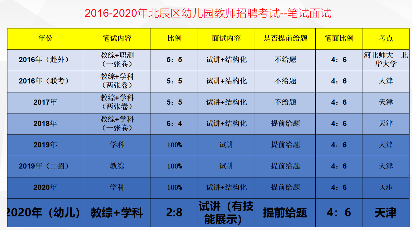 老师总结了近五年北辰区教招的笔面内容,可以看到,北辰的笔试其实是变化不定的,想考上北辰教师的同学,教综和学科都要好好学习!