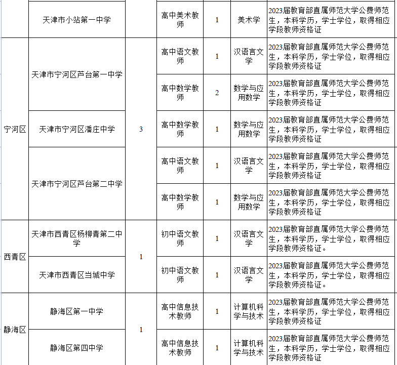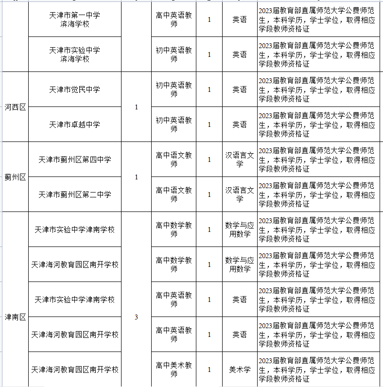 专项招聘对象为教育部直属师范大学2023届天津市生源公费师范毕业生;应聘天津生源公费师范生须符合用人单位岗位需求;应聘者应遵纪守法、品行端正、身体健康。