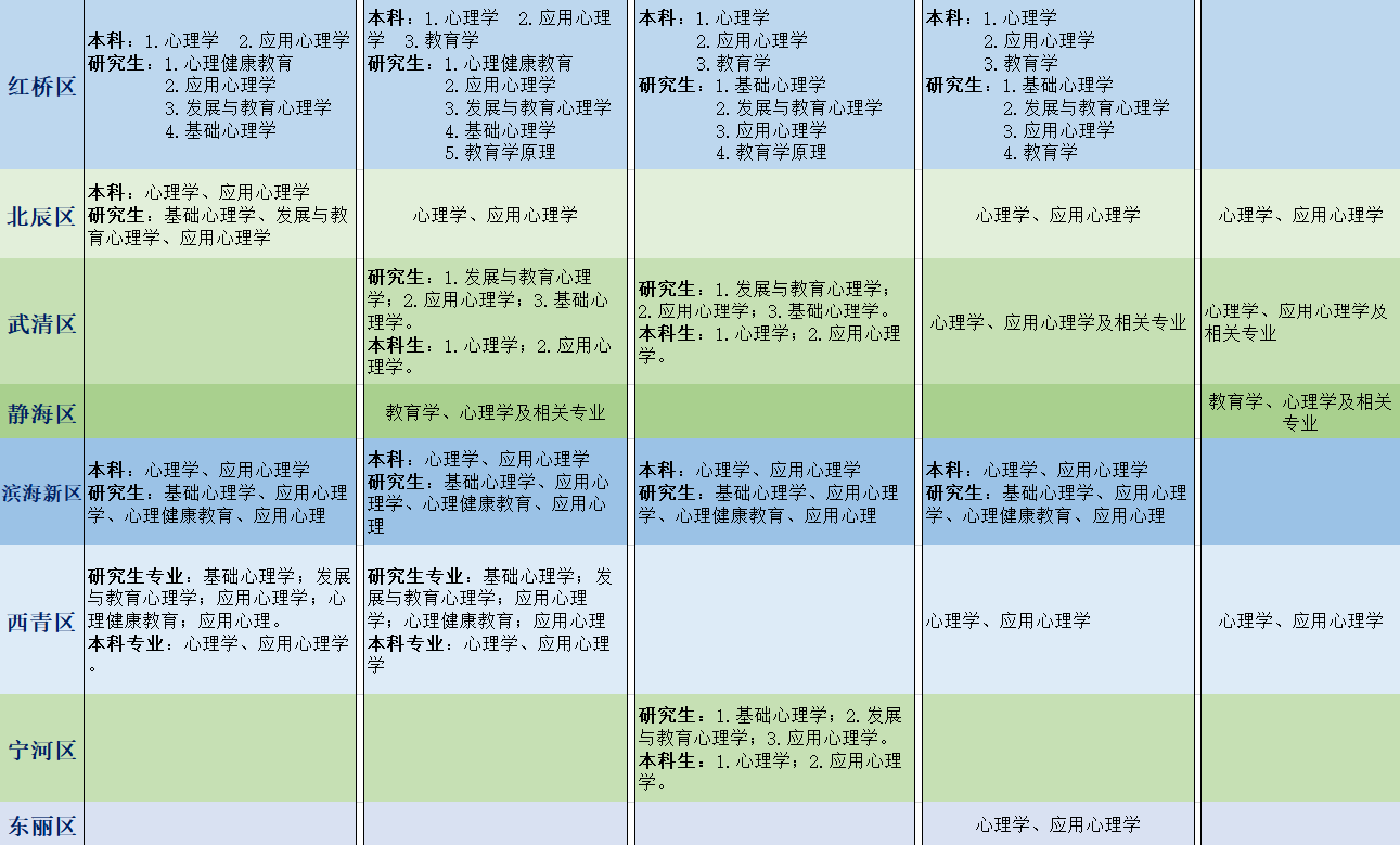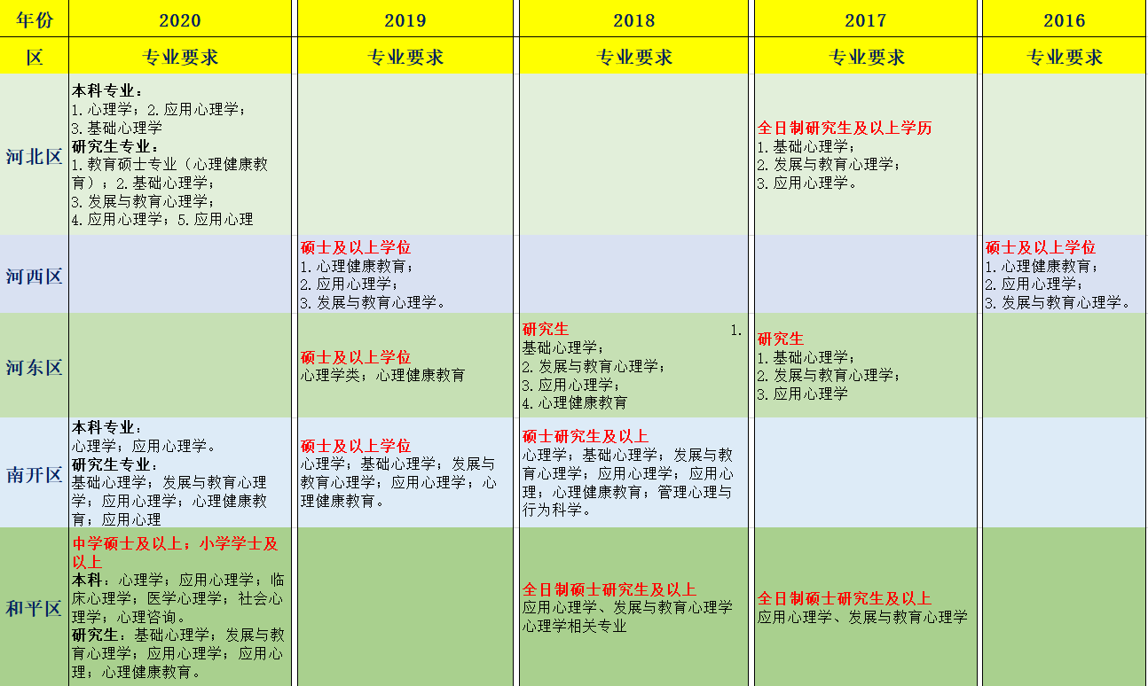 天津主要区中,只有红桥区和滨海新区近四年连续招聘心理教师,在学历和专业限制上没有太多变化。