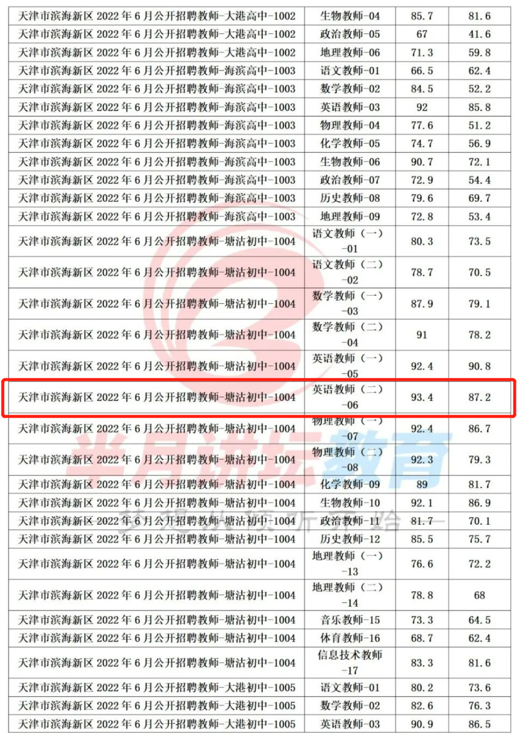 进面分数第二高的岗位是:塘沽初中——英语教师(二)93.4分,此岗位的最低进面分数是87.2分;最低分是要比上一个数学岗位分数高的,2022年滨海新区各岗位的进面分数,上了90分的,有很多都是英语岗位!英语岗位想要拉开分差实在是太难了!多多练习,卷面上的任何一处都马虎不得!