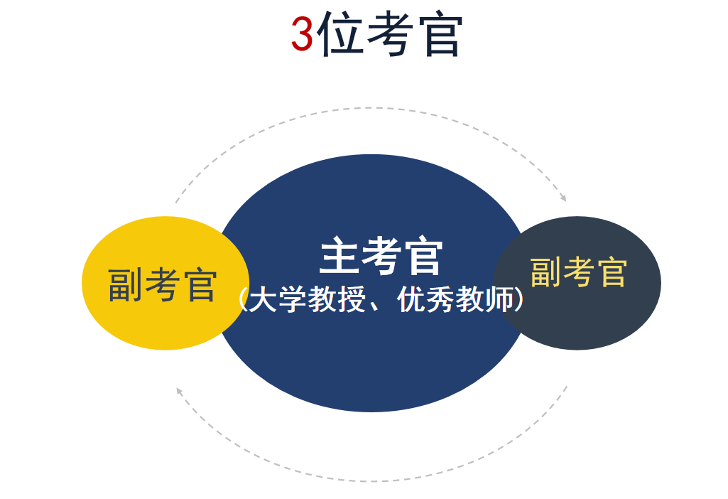 教资面试三位考官,配置一般是:一位主考官是大学教师或者优秀教师;两位副考官,一位专业老师、一位教育部门或学校管理人员。