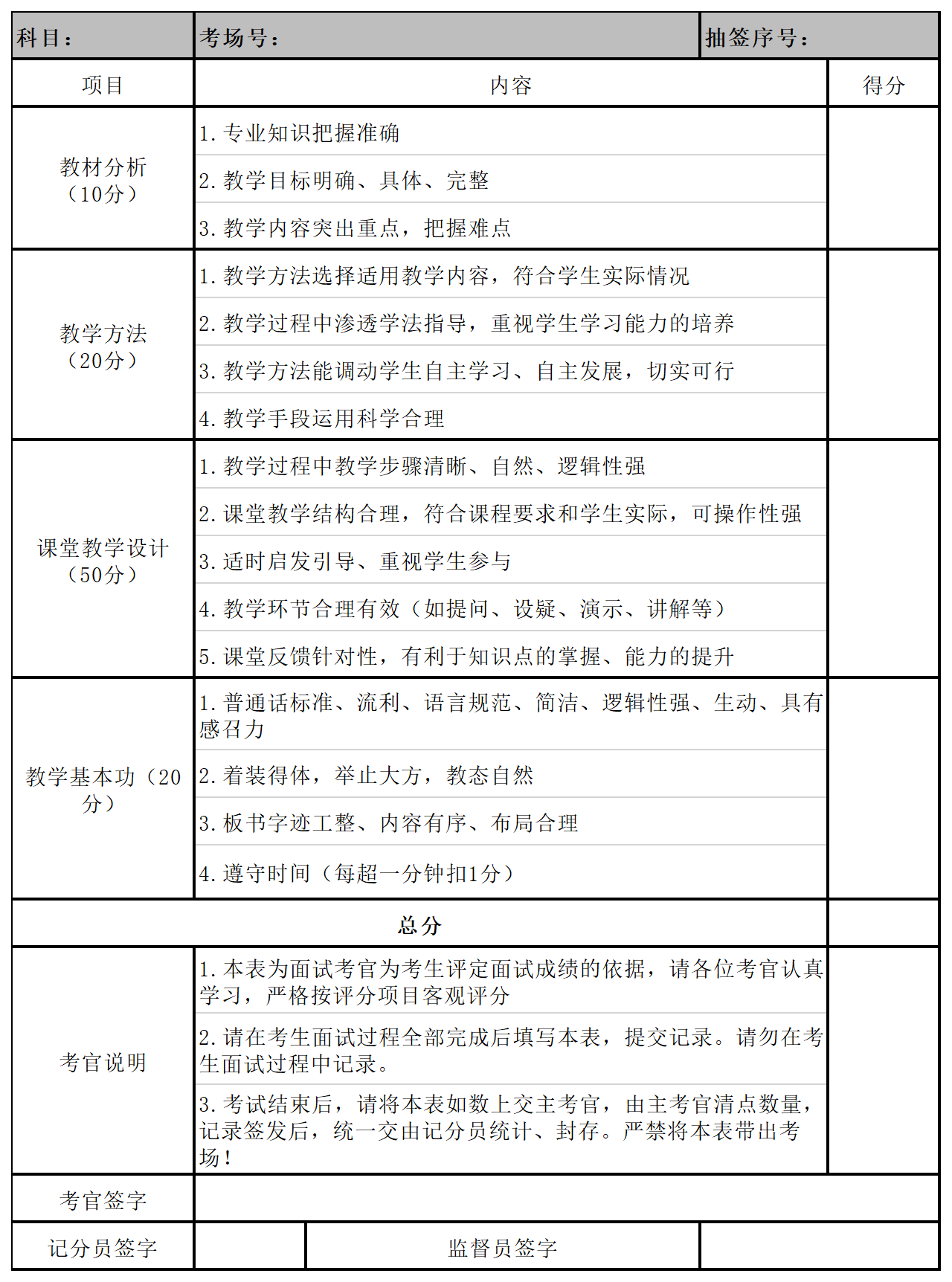 - 第二层考官:其它学科、专业教师、优秀教师、教研室主任