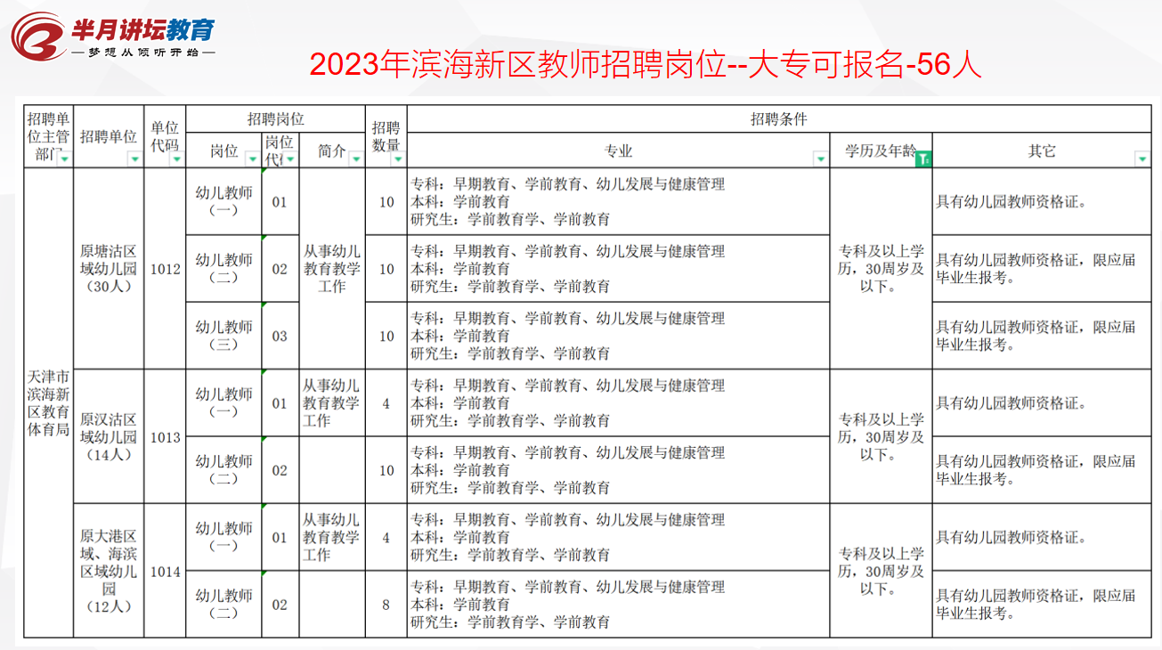 今年滨海新区幼儿教师没有不限专业岗位,但是有大专可报岗位,往年专科能报的岗位还会限制年龄25周岁以下,今年也是限制到了30岁,对大专的学生还是很友好的,符合条件的同学抓住机会认真复习!