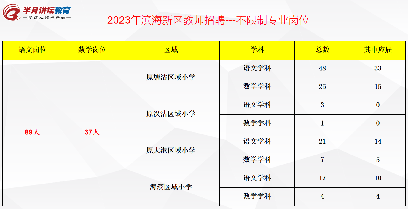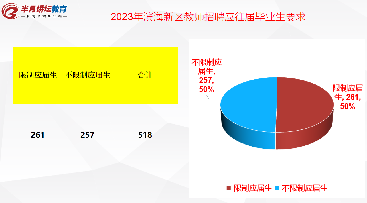 今年滨海新区教招对于应往届的要求,占比相对均衡,应届生岗位人数261人,不限应届生岗位人数257人,基本是对半分了,不像津南区很多岗位都只能应届生报。