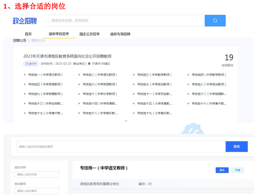 首先进入智联网站,很多同学说找不到津南区的公告和入口,网站上有【政企招聘】这一栏,随后进入【政府单位招考】然后点击【天津市】即可看到津南区教招~