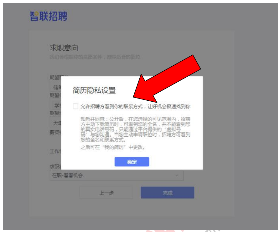 最后有一项是简历隐私设置,建议不要勾选,因为政企报名的注册信息是真实且信息较多的,打卡后智联上的一些私企也会看到并联系你应聘~