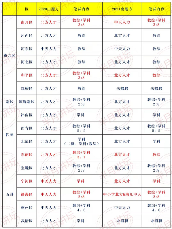 这三个区虽然出题方有变动,但是笔试内容和占比没有变化。和平区和东丽区出题方没有变化,仍然都是北方人才出题,但是考试内容上有所变化,2023年笔试考【教综+学科】,2023年两个区都只考了【教综】。