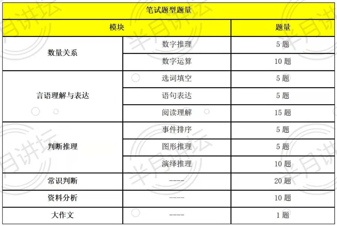 客观题:行测+公基;主观题:近几年都是考察关于“三农”问题的写作。